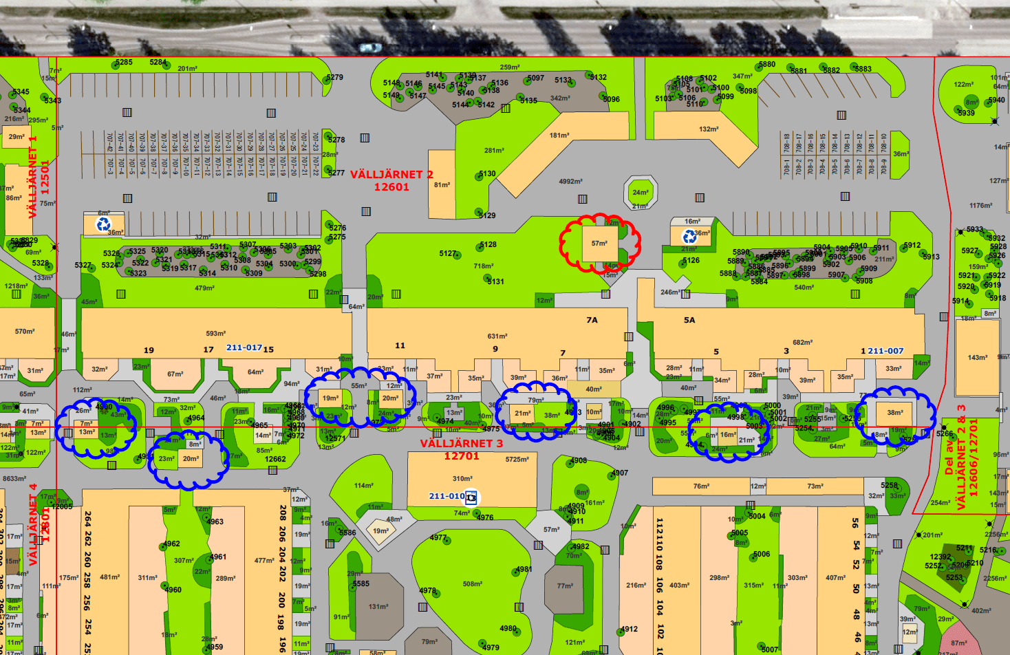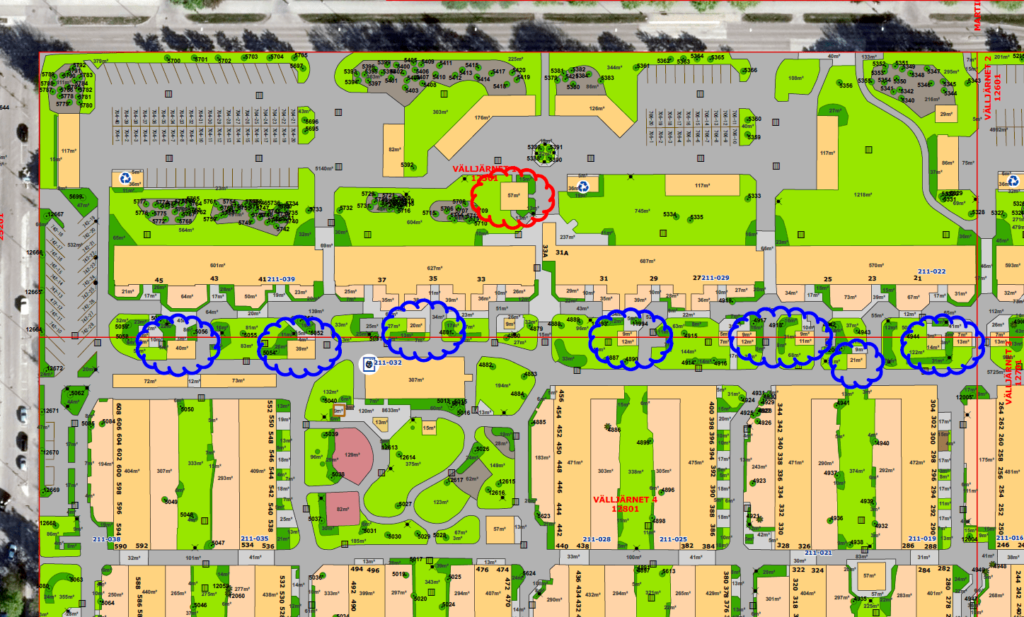 På bilderna kan du se inringat i blått var förråden ligger som vi nu ska riva. Arbetet startar vid Välljärnsgatan 45.
